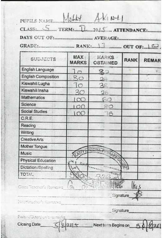 We have cleared the balance and paid up all that was required till the end of 2014. Molly’s teachers say she is a bright girl and if well-educated she will achieve so much in life. She has been promoted to standard 5.